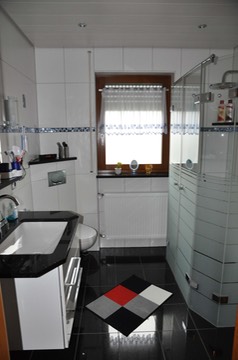 Boden, barrierefreie Duschtasse, Waschtischplatte sowie alle Ablagen sind in schwarzem Granit geplant. Die Kombination von viel Weiß bei Wandgestaltung und Keramikwahl mit diesem hochglanzpolierten, schwarzen Granit verleiht dem neuen Bad eine klare, leichte und dabei luxuriöse Atmosphäre.